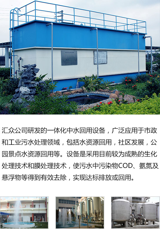 匯眾公司研發的一體化中水回用設備,廣泛應用于市政和工業污水處理領域,包括水資源回用,社區發展,公園景點水資源回用等。設備是采用目前較為成熟的生化處理技術和膜處理技術,使污水中污染物COD、氨氮及懸浮物等得到有效去除,實現達標排放或回用。